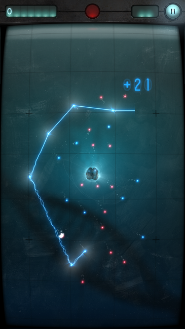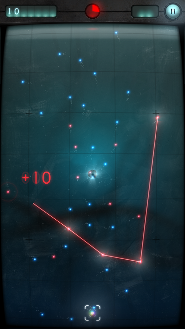 Всего из центральной точки расходятся точки двух цветов – красные и синие. На верхней части экрана находятся две сферы, красного и синего цвета. Когда точки соединяются и исчезают, они наполняют сферу соответствующего цвета. Нужно следить за тем, чтобы сферы всегда были наполнены. Если точки не получится соединить в фигуру, то они уйдут за пределы экрана и сфера потеряет некоторый объем.