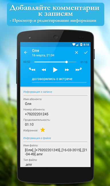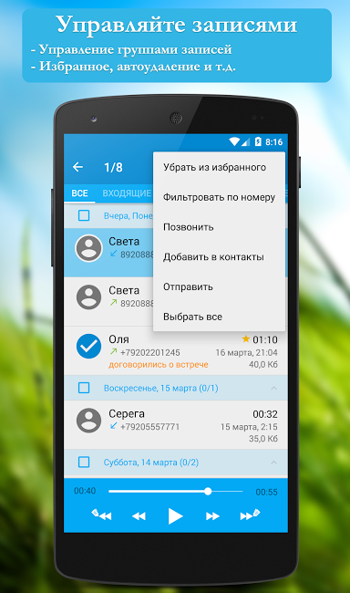 Приложение позволяет выполнять запись звонков и автоматически, и вручную. Управлять настройками записи можно прямо во время разговора. Старт записи, добавление ее в избранное или написание комментария – все эти команды быстро выполняются с помощью одного нажатия на кнопку.