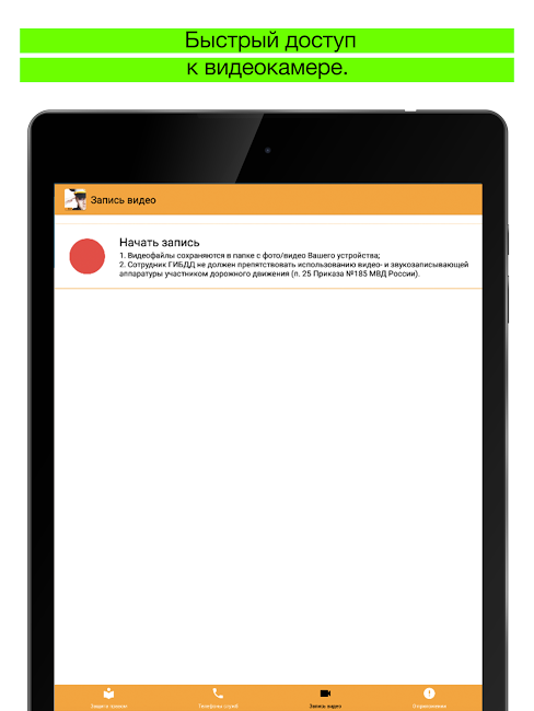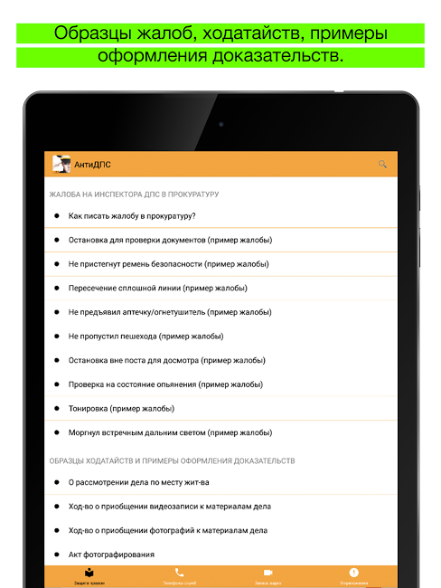 Приложение «АнтиДПС: автоюрист 2015» помогает правильно составлять ходатайства, жалобы и оформлять доказательств на месте происшествия. С его помощью вы также сможете быстро вызвать скорую медицинскую помощь, пожарную охрану, милицию, МЧС или позвонить на телефон доверия. «АнтиДПС: автоюрист 2015» помогает быстро включать видеозапись для того, чтобы действия работника ДПС были зафиксированы.
